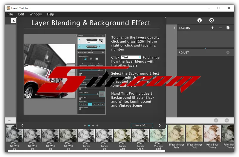 该工具采用非破坏性编辑架构,所有颜色、滤镜、光效均以独立图层形式存在,可随时回退、调整透明度或混合模式。内置数十种艺术风格预设(如水彩晕染、粉彩柔和、油画厚重、胶片暖调),并支持添加镜头光晕、柔焦、颗粒噪点等氛围效果,一键提升画面电影感。特别适合用于修复家族老照片、制作怀旧相册、NFT 数字艺术创作或影视概念图预演。所有处理在本地完成,不联网、不上传图片、无云依赖,确保珍贵影像隐私安全。相比全自动AI上色工具缺乏控制力,Hand Tint Pro 以“人机协同 + 分层编辑 + 艺术导向”成为追求细节与情感表达用户的首选。